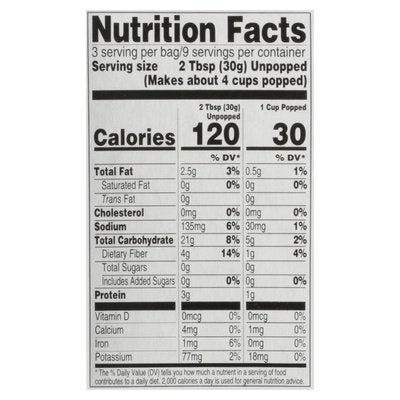PRODUCT DETAILS: 30 calories per popped cup! USDA Organic. 100% Whole Grain: 28 g or more per serving. 100% of the grain is whole grain. WholeGrainsCouncil.org. Certified Organic by Quality Assurance International (QAI). Free from: PFOAS; Artificial preservatives; Hydrogenated oils. Non-GMO Project verified. nongmoproject.org. Microwave. Our harvest of Non-GMO, organic, and quality products are delicious and genuinely simple. No confusion, just what you need. That's Field Day. Wildly simple. Make Field Day Organic Salted Popcorn a part of movie night! Made with Non-GMO corn, it's bursting with flavor and you'll never guess that it has 28 g of whole grains per serving. Go ahead, get lost in that movie and enjoy our delicious popcorn. fielddayproducts.com. Please recycle carton. Produced in the USA with domestic and imported ingredients.