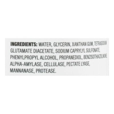 INGREDIENTS: Water, Glycerin, Xanthan Gum, Tetrasodium Glutamate Diacetate, Sodium Caprylyl Sulfonate, Phenylpropyl Alcohol, Propanediol, Benzisothiazolinone, Alpha-Amylase, Cellulase, Pectate Lyase, Mannanase, Protease.
