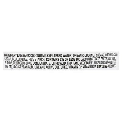 INGREDIENTS: Organic Coconutmilk (Filtered Water, Organic Coconut Cream), Organic Cane Sugar, Blueberries, Rice Starch, Contains 2% or Less of: Calcium Citrate, Pectin, Natural Flavor, Blueberry Juice Concentrate, Citric Acid, Fruit and Vegetable Juice Concentrate (for Color), Locust Bean Gum, Live and Active Cultures, Vitamin D2, Vitamin B12. Live Active Cultures Include: S. Thermophilus, L. Rhamnosus, L. Acidophilus, L. Bulgaricus, Bifidobacterium Spp., L. Casei, L. Paracasei, L. Plantarum.