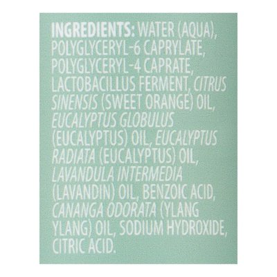 INGREDIENTS: Water (Aqua), Polyglyceryl-6 Caprylate, Polyglyceryl-4 Caprate, Lactobacillus Ferment, Citrus Sinensis (Sweet Orange) Oil, Eucalyptus Globulus (Eucalyptus) Oil, Eucalyptus Radiata (Eucalyptus) Oil, Lavandula Intermedia (Lavandin) Oil, Benzoic Acid, Cananga Odorata (Ylang Ylang) Oil, Sodium Hydroxide, Citric Acid.