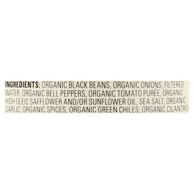 INGREDIENTS: Organic Black Beans, Organic Onions, Filtered Water, Organic Bell Peppers, Organic Tomato Puree, Organic High Oleic Safflower and/or Sunflower Oil, Sea Salt, Organic Garlic, Organic Spices, Organic Green Chiles, Organic Cilantro.