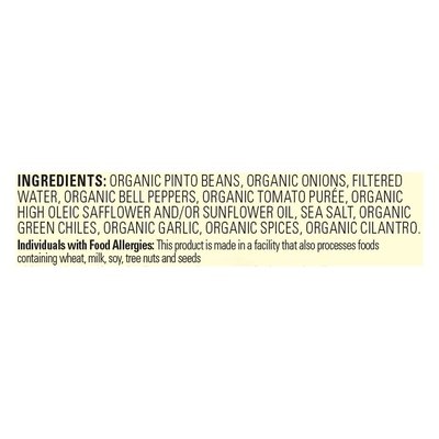 INGREDIENTS: Organic Pinto Beans, Organic Onions, Filtered Water, Organic Bell Peppers, Organic Tomato Puree, Organic High Oleic Safflower and/or Sunflower Oil, Sea Salt, Organic Green Chiles, Organic Garlic, Organic Spices, Organic Cilantro.