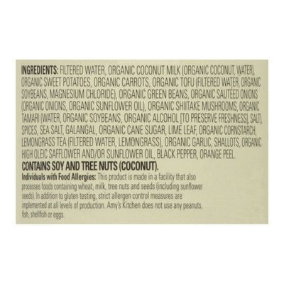 INGREDIENTS: Filtered Water, Organic Coconut Milk (Organic Coconut, Water), Organic Sweet Potatoes, Organic Carrots, Organic Tofu (Filtered Water, Organic Soybeans, Magnesium Chloride), Organic Green Beans, Organic Sauteed Onions (Organic Onions, Organic Sunflower Oil), Organic Shiitake Mushrooms, Organic Tamari (Water, Organic Soybeans, Organic Alcohol [to Preserve Freshness], Salt), Spices, Sea Salt, Galangal, Organic Cane Sugar, Lime Leaf, Organic Cornstarch, Lemongrass Tea (Filtered Water, Lemongrass), Organic Garlic, Shallots, Organic High Oleic Safflower and/or Sunflower Oil, Black Pepper, Orange Peel.
