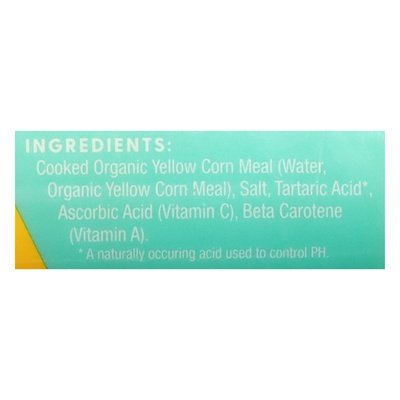 INGREDIENTS: Cooked Organic Yellow Corn Meal (Water, Organic Yellow Corn Meal), Salt, Tartaric Acid (a Naturally Occurring Acid Used to Control pH), Ascorbic Acid (Vitamin C), Beta Carotene (Vitamin A).