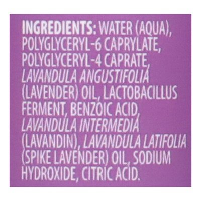 INGREDIENTS: Water (Aqua), Lavandula Angustifolia (Lavender) Oil, Lactobacillus Ferment, Benzoic Acid, Lavandula Intermedia (Lavandin) Oil, Lavandula Latifolia (Spike Lavender) Oil, Sodium Hydroxide, Citric Acid.