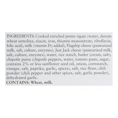 INGREDIENTS: Cooked Enriched Penne Rigate (Water, Durum Wheat Semolina, Niacin, Iron, Thiamin Mononitrate, Riboflavin, Folic Acid), Milk (Vitamin D3 Added), Flagship Cheese (Pasteurized Milk, Salt, Culture, Enzymes), Just Jack Cheese (Pasteurized Milk, Salt, Culture, Enzymes), Water, Rice Starch, Butter (Cream, Salt), Chipotle Puree (Chipotle Peppers, Water, Tomato Paste, Sugar, Contains 2% or Less Sunflower Seed Oil, Onion, Cornstarch, Vinegar, Salt, Paprika, Garlic, Spices), Salt, Rice Flour, Chili Powder (Chili Pepper and Other Spices, Salt, Garlic Powder), Dehydrated Garlic.