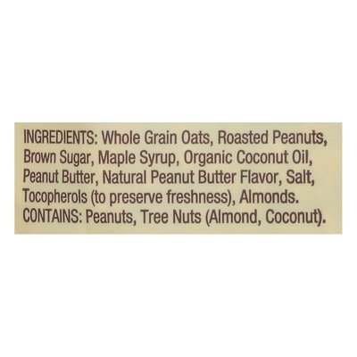 INGREDIENTS: Whole Grain Oats, Roasted Peanuts, Brown Sugar, Maple Syrup, Organic Coconut Oil, Peanut Butter, Natural Peanut Butter Flavor, Salt, Tocopherols (to Preserve Freshness), Almonds.