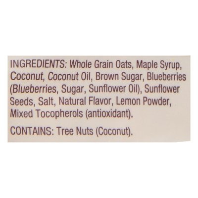 INGREDIENTS: Whole Grain Oats, Maple Syrup, Coconut, Coconut Oil, Brown Sugar, Blueberries (Blueberries, Sugar, Sunflower Oil), Sunflower Seeds, Salt, Natural Flavor, Lemon Powder, Mixed Tocopherols (Antioxidant).
