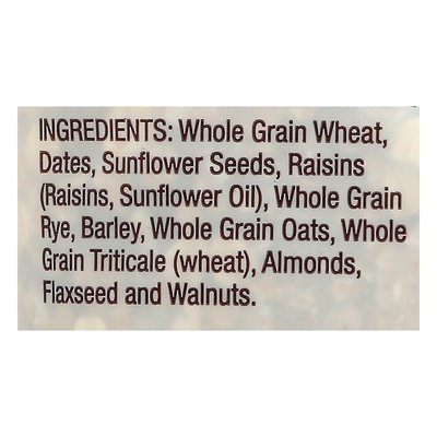 INGREDIENTS: Whole Grain Wheat, Dates, Sunflower Seeds, Raisins (Raisins, Sunflower Oil), Whole Grain Rye, Barley, Whole Grain Oats, Whole Grain Triticale (Wheat), Almonds, Flaxseeds and Walnuts.