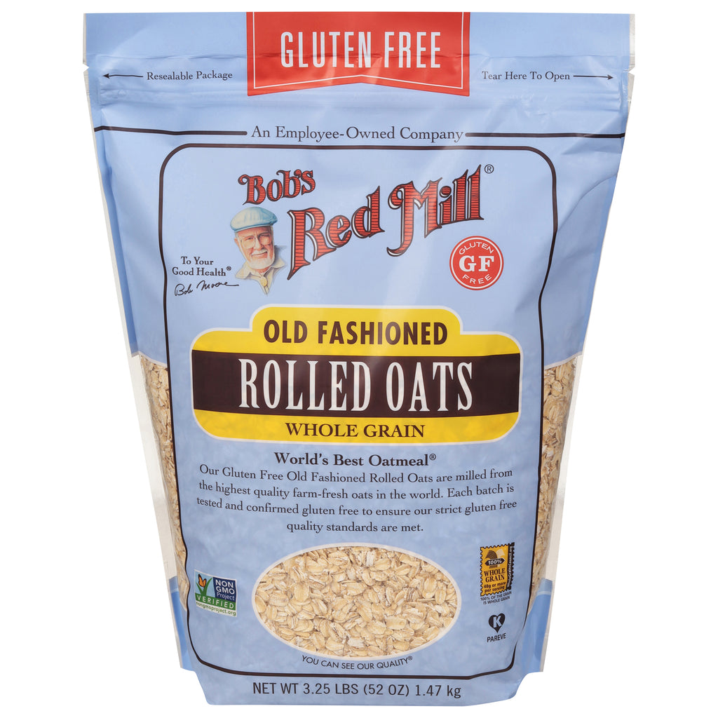 PRODUCT DETAILS: 100% Whole Grain. 48g or more per serving. 100% of the grain is whole grain. WholeGrainsCouncil.org. Gluten free. Tested and confirmed gluten free. Non-GMO Project verified. nongmoproject.org. An employee owned company. To your good health. World's Best Oatmeal our gluten free old fashioned rolled oats are milled from the highest quality farm-fresh oats in the world. Each batch is tested and confirmed gluten free to ensure our strict gluten free quality standards are met. You can see our quality. Dear friends. What we eat in the morning makes all the difference in how we get through the rest of the day. A bowl of nutritious whole grain oatmeal starts you off right and keeps your hunger at bay throughout the morning. In my view, no food on earth is better! To your good health. nongmoproject.org. WholeGrainsCouncil.org. bobsredmill.com/oatmeal. bobsredmill.com. Top it off. Find scrumptious topping suggestions at bobsredmill.com/oatmeal. For information and recipes, visit bobsredmill.com. Resealable package.