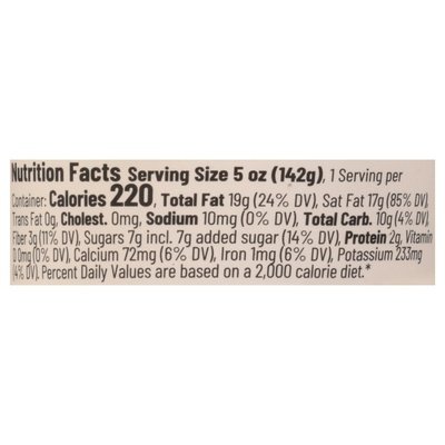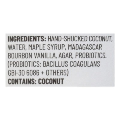 INGREDIENTS: Hand-Shucked Coconut, Water, Maple Syrup, Madagascar Bourbon Vanilla, Agar, Probiotics. (Probiotics: Bacillus Coagulans GBI-30 6086 + Others).