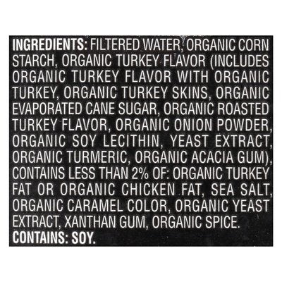 INGREDIENTS: Filtered Water, Organic Corn Starch, Organic Turkey Flavor (Includes Organic Turkey Flavor with Organic Gum Arabic, Sea Salt, Organic Turkey Fat, Organic Evaporated Cane Syrup, Organic Caramel Color, Organic Onion Powder, Organic Soy Lecithin, Yeast Extract, Organic Turmeric), Contains Less than 2% of, Organic Turkey Fat or Organic Chicken Fat, Sea Salt, Organic Caramel Color, Organic Yeast Extract Xanthan Gum, Organic Spice.