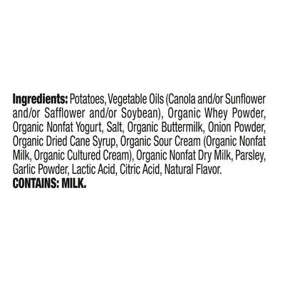 INGREDIENTS: Potatoes, Safflower and/or Sunflower and/or Canola Oil, Yogurt Powder (Whey, Cultured Nonfat Milk), Nonfat Dry Milk, Salt, Dried Onion, Dried Cane Syrup, Sour Cream, (Cultured Cream, Nonfat Milk), Dried Parsley, Garlic Powder, Turmeric, Lactic Acid, Citric Acid.