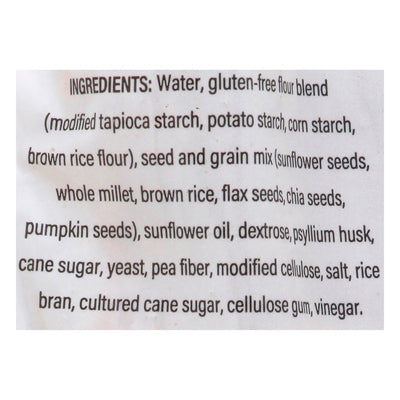 INGREDIENTS: Water, Gluten-Free Flour Blend (Modified Tapioca Starch, Potato Starch, Corn Starch, Brown Rice Flour), Seed and Grain Mix (Sunflower Seeds, Whole Millet, Brown Rice, Flax Seeds, Chia Seeds, Pumpkin Seeds), Sunflower Oil, Dextrose, Psyllium Husk, Cane Sugar, Yeast, Pea Fiber, Modified Cellulose, Salt, Rice Bran, Cultured Cane Sugar, Cellulose Gum, Vinegar.