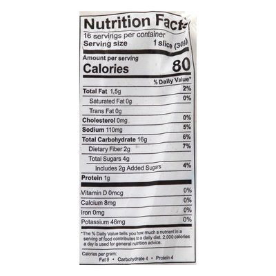 INGREDIENTS: Water, Gluten-Free Flour Blend (Modified Tapioca Starch, Potato Starch, Corn Starch, Brown Rice Flour), Raisins, Sunflower Oil, Dextrose, Cane Sugar, Psyllium Husk, Yeast, Pea Fiber, Modified Cellulose, Salt, Rice Bran, Cultured Cane Sugar, Cellulose Gum, Cinnamon.