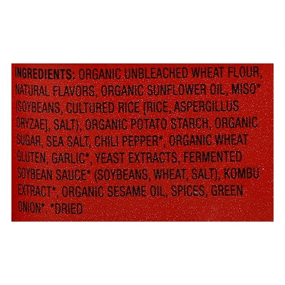 INGREDIENTS: Organic Unbleached Wheat Flour, Natural Flavors, Organic Sunflower Oil, Miso (Dried) (Soybeans, Cultured Rice [Rice, Aspergillus Oryzae], Salt), Organic Potato Starch, Organic Sugar, Sea Salt, Chili Pepper (Dried), Organic Wheat Gluten, Garlic (Dried), Yeast Extracts, Fermented Soybean Sauce (Dried) (Soybeans, Wheat, Salt), Kombu Extract (Dried), Organic Sesame Oil, Spices, Green Onion (Dried).