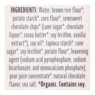 INGREDIENTS: Water, Brown Rice Flour (Organic), Potato Starch (Organic), Corn Flour (Organic), Semisweet Chocolate Chips (Organic) (Cane Sugar (Organic), Chocolate Liquor (Organic), Cocoa Butter (Organic), Soy Lecithin, Vanilla Extract (Organic)), Soy Oil (Organic), Tapioca Starch (Organic), Cane Sugar (Organic), Soy Lecithin (Organic), Potato Flour (Organic), Leavening Agent (Sodium Acid Pyrophosphate, Sodium Bicarbonate, and Monocalcium Phosphate), Pear Juice Concentrate (Organic), Natural Chocolate Flavor, Sea Salt.