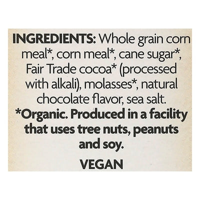 INGREDIENTS: Whole Grain Corn Meal (Organic), Corn Meal (Organic), Cane Sugar (Organic), Fair Trade Cocoa (Organic) (Processed with Alkali), Molasses (Organic), Natural Chocolate Flavor, Sea Salt.