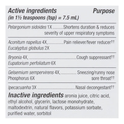 INGREDIENTS: In 1.5 Teaspoons (tsp) = 7.5 mL Active Ingredients: *Pelargonium Sidoides 1X, Shortens Duration & Reduces Severity of Upper Respiratory Symptoms; *Aconitum Napellus 4X, Eucalyptus Globulus 2X, Pain Reliever/Fever Reducer; *Bryonia 4X, Eupatorium Perfoliatum 6X, Cough Suppressant; *Gelsemium Sempervirens 4X, Phosphorus 6X, Sneezing/Runny Nose Sore Throat; *Ipecacuanha 3X, Nasal Decongestant. Inactive Ingredients: Aronia Juice, Citric Acid, Ethyl Alcohol, Glycerin, Lactose Monohydrate, Maltodextrin, Natural Flavors, Potassium Sorbate, Purified Water, Sorbitol. *These indications are based solely on traditional homeopathic use. They have not been evaluated by the Food & Drug Administration.