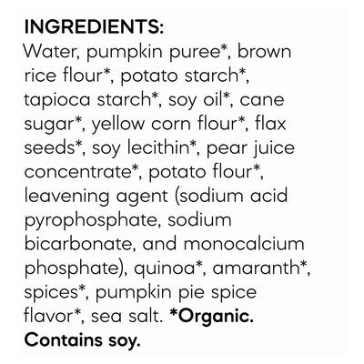 INGREDIENTS:  Water, Pumpkin Puree (Organic), Brown Rice Flour (Organic), Potato Starch (Organic), Tapioca Starch (Organic), Soy Oil (Organic), Cane Sugar (Organic), Yellow Corn Flour (Organic), Flax Seeds (Organic), Soy Lecithin (Organic), Pear Juice Concentrate (Organic), Potato Flour (Organic), Leavening Agent (Sodium Acid Pyrophosphate, Sodium Bicarbonate, and Monocalcium Phosphate), Quinoa (Organic), Amaranth (Organic), Spices (Organic), Pumpkin Pie Spice Flavor (Organic), Sea Salt.