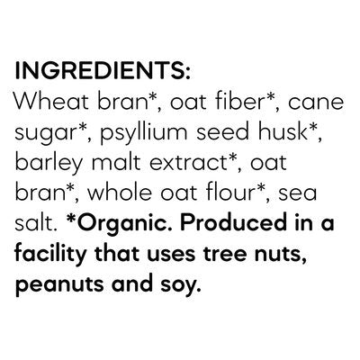 INGREDIENTS: Wheat Bran (Organic), Oat Fiber (Organic), Cane Sugar (Organic), Psyllium Seed Husk (Organic), Barley Malt Extract (Organic), Oat Bran (Organic), Whole Oat Flour (Organic), Sea Salt (Organic).