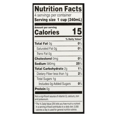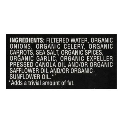 INGREDIENTS: Filtered Water, Organic Onions, Organic Celery, Organic Carrots, Sea Salt, Organic Spices, Organic Expeller Pressed Canola Oil and/or Organic Safflower Oil and/or Organic Sunflower Oil (Adds a Trivial Amount of Fat), Organic Garlic.