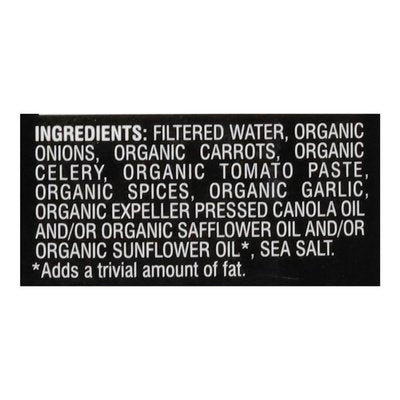 INGREDIENTS: Filtered Water, Organic Onions, Organic Carrots, Organic Celery, Organic Tomato Paste, Organic Spices, Organic Garlic, Organic Expeller Pressed Canola Oil and/or Organic Safflower Oil and/or Organic Sunflower Oil (Adds a Trivial Amount of Fat), Sea Salt.