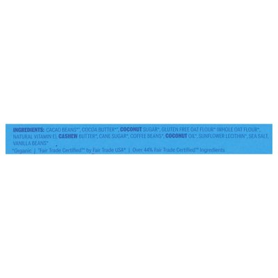 INGREDIENTS: Cacao Beans (Organic) (Fair Trade Certified), Cocoa Butter (Organic) (Fair Trade Certified), Coconut Sugar (Organic), Gluten Free Oat Flour (Organic) (Whole Oat Flour (Organic), Natural Vitamin E), Cashew Butter (Organic), Cane Sugar (Organic), Coffee Beans (Organic), Coconut Oil (Organic), Sunflower Lecithin (Organic), Sea Salt, Vanilla Beans (Organic).