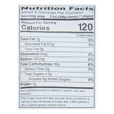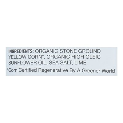 INGREDIENTS: Organic Stone Ground Yellow Corn (Corn Certified Regenerative by a Greener World), Organic High Oleic Sunflower Oil, Sea Salt, Lime.