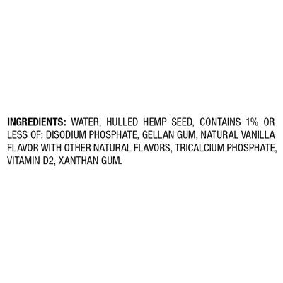INGREDIENTS: Hemp Nut Base (Filtered Water, Whole Hemp Nut [Shelled Hemp Seed]), Natural Vanilla Flavor with Other Natural Flavors, Calcium Phosphate, Disodium Phosphate, Gum Arabic, Xanthan Gum, Carrageenan, Vitamin A Palmitate, Vitamin D2, Riboflavin (B2), Vitamin B12.