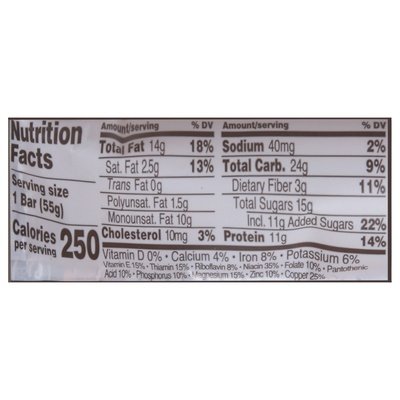 INGREDIENTS: Peanut Butter (Organic), Honey (Organic), Maple Syrup (Organic), Nonfat Dry Milk (Organic), Peanut Flour (Organic), Crisp Quinoa, Cashew Butter, Toasted Honey Oats (Rolled Oats, Honey, Coconut Oil, Maple Syrup, Tapioca Syrup), Cocoa (Organic), Rice Protein (Organic), Date Paste (Organic), Whole Egg Powder (Organic), Dark Chocolate (Organic) (Chocolate (Organic) (Fair Trade Ingredient), Cane Sugar (Organic) (Fair Trade Ingredient), Cocoa Butter (Organic) (Fair Trade Ingredient)), Dried Whole Food Powders (Kale (Organic), Flax Seed (Organic), Rose Hip (Organic), Orange (Organic), Lemon (Organic), Papaya (Organic), Tomato (Organic), Apple (Organic), Alfalfa (Organic), Celery (Organic), Kelp (Organic), Dulse (Organic), Carrot (Organic), Spinach (Organic)), Cocoa Extract (Organic), Sea Salt, Vanilla Extract (Organic), Flax Seed Oil (Organic), Sesame Seed Oil (Organic), Olive Oil (Organic), Pumpkin Seed Oil (Organic).