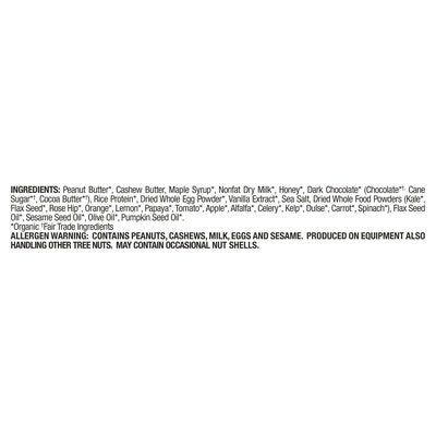DESCRIPTION: The original refrigerated protein bar. 12 g protein. Protein 18% DV. Gluten free. Low GI. See nutrition panel for content. Low Glycemic: Low Glycemic Index (GI) foods digest slowly to keep you fuller, longer. Non-GMO Project verified. nongmoproject.org. 20+ super foods. Enjoy 1 week on the go. Our Family Story: Our dad was a health food pioneer before most folks had heard of health food. To help our king-size family eat healthy on-the-go, he mixed nut butter and honey with a superfood blend, took one bite and proclaimed, It's perfect! - and the original Perfect Bar recipe was born.Today, we're combining whole food protein, clean ingredients and an incredible taste to share Dad's recipe with the world. Perfect Bar - a bar so fresh, it belongs in the fridge. AKA. Ashley Koff. Approved Est 2002. perfectsnacks.com. Get the whole nutty story at perfectsnacks.com. < Peanut Butter (Organic), Cashew Butter, Maple Syrup (Organic), Nonfat Dry Milk (Organic), Honey (Organic), Dark Chocolate (Organic) (Chocolate (Organic) (Fair Trade Ingredients), Cane Sugar (Organic) (Fair Trade Ingredients), Cocoa Butter (Organic) (Fair Trade Ingredients)), Rice Protein (Organic), Dried Whole Egg Powder (Organic), Vanilla Extract (Organic), Sea Salt, Dried Whole Food Powders (Kale (Organic), Flax Seed (Organic), Rose Hip (Organic), Orange (Organic), Lemon (Organic), Papaya (Organic), Tomato (Organic), Apple (Organic), Alfalfa (Organic), Celery (Organic), Kelp (Organic), Dulse (Organic), Carrot (Organic), Spinach (Organic)), Flax Seed Oil (Organic), Sunflower Oil (Organic), Sesame Seed Oil (Organic), Olive Oil (Organic), Pumpkin Seed Oil (Organic).