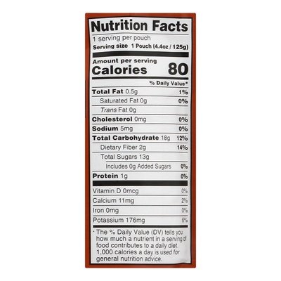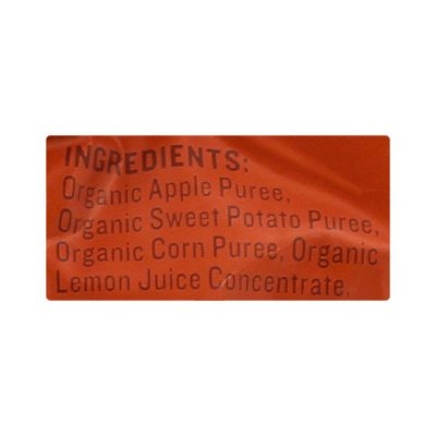 DESCRIPTION: USDA Certified Organic. USDA Organic. Certified Organic by Oregon Tilth. Non GMO Project Verified. nongmoproject.org. Whether it€™s the morning rush or after school club, our squeezy pouches are ideal to carry in your bag for snack time. Not diluted with water. www.pumpkintreesnacks.com. BPA free packaging. < Organic Apple Puree, Organic Sweet Potato Puree, Organic Corn Puree, Organic Lemon Juice Concentrate.