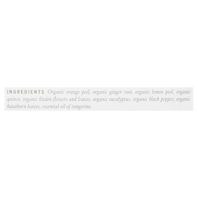 INGREDIENTS: Organic Orange Peel, Organic Ginger Root, Organic Lemon Peel, Organic Quince, Organic Linden Flowers and Leaves, Organic Eucalyptus, Organic Black Pepper, Organic Hawthorn Leaves, Essential Oil of Tangerine.