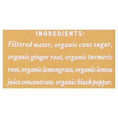 INGREDIENTS: Filtered Water, Organic Cane Sugar, Organic Ginger Root, Organic Turmeric Root, Organic Lemongrass, Organic Lemon Juice Concentrate, Organic Black Pepper.