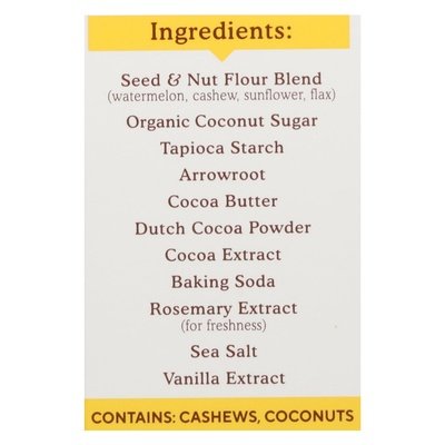 INGREDIENTS: Seed & Nut Flour Blend (Watermelon, Cashew, Sunflower, Flax), Coconut Sugar, Tapioca Starch, Arrowroot, Cocoa Butter, Dutch Cocoa Powder, Cocoa Extract, Baking Soda, Rosemary Extract (for Freshness), Sea Salt, Vanilla Extract.