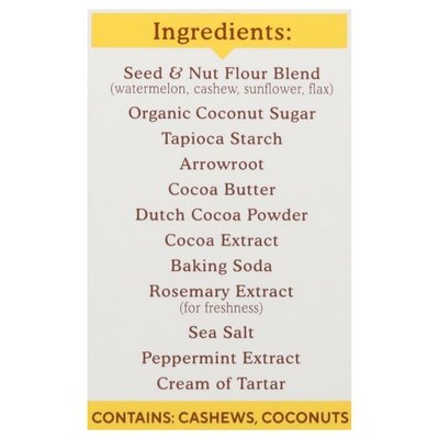 INGREDIENTS: Seed & Nut Flour Blend (Watermelon, Cashew, Sunflower, Flax), Organic Coconut Sugar, Tapioca Starch, Arrowroot, Cocoa Butter, Dutch Cocoa Powder, Cocoa Extract, Baking Soda, Rosemary Extract (for Freshness), Sea Salt, Peppermint Extract, Cream of Tartar.