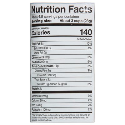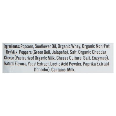 INGREDIENTS: Popcorn, Sunflower Oil, Organic Whey, Organic Non-Fat Dry Milk, Peppers (Green Bell, Jalapeno), Salt, Organic Cheddar Cheese (Pasteurized Organic Milk, Cheese Culture, Salt, Enzymes), Natural Flavors, Yeast Extract, Lactic Acid Powder, Paprika Extract (for Color).