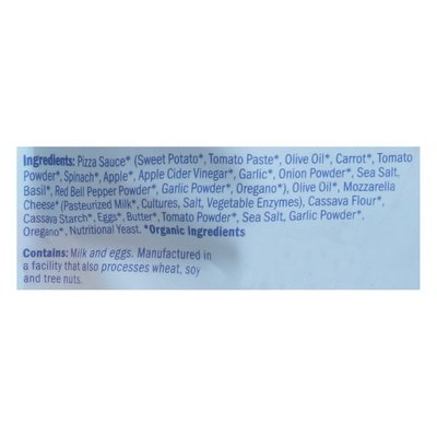 INGREDIENTS:  Pizza Sauce (Organic Ingredients) (Sweet Potato (Organic Ingredients), Tomato Paste (Organic Ingredients), Olive Oil (Organic Ingredients), Carrot (Organic Ingredients), Tomato Powder (Organic Ingredients), Spinach (Organic Ingredients), Apple (Organic Ingredients), Apple Cider Vinegar (Organic Ingredients), Garlic (Organic Ingredients), Onion Powder (Organic Ingredients), Sea Salt, Basil (Organic Ingredients), Red Bell Pepper Powder (Organic Ingredients), Garlic Powder (Organic Ingredients), Oregano (Organic Ingredients)), Olive Oil (Organic Ingredients), Mozzarella Cheese (Organic Ingredients) (Pasteurized Milk (Organic Ingredients), Cultures, Salt, Vegetable Enzymes), Cassava Flour (Organic Ingredients), Cassava Starch (Organic Ingredients), Eggs (Organic Ingredients), Butter (Organic Ingredients), Tomato Powder (Organic Ingredients), Sea Salt, Garlic Powder (Organic Ingredients), Oregano (Organic Ingredients), Nutritional Yeast.