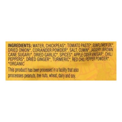 INGREDIENTS: Water, Chickpeas (Organic), Tomato Paste (Organic), Dried Onion (Organic), Sunflower Oil (Organic) and/or Canola Oil (Organic), and/or Soybean Oil (Organic); Less Than 2% of : Coriander Powder Salt, Cumin (Organic), Jaggery (Brown Cane Sugar) (Organic), Dried Garlic (Organic), Spices (Organic), Apple Cider Vinegar (Organic), Chili Peppers (Organic), Dried Ginger (Organic), Turmeric (Organic), Red Chili Pepper Powder (Organic).