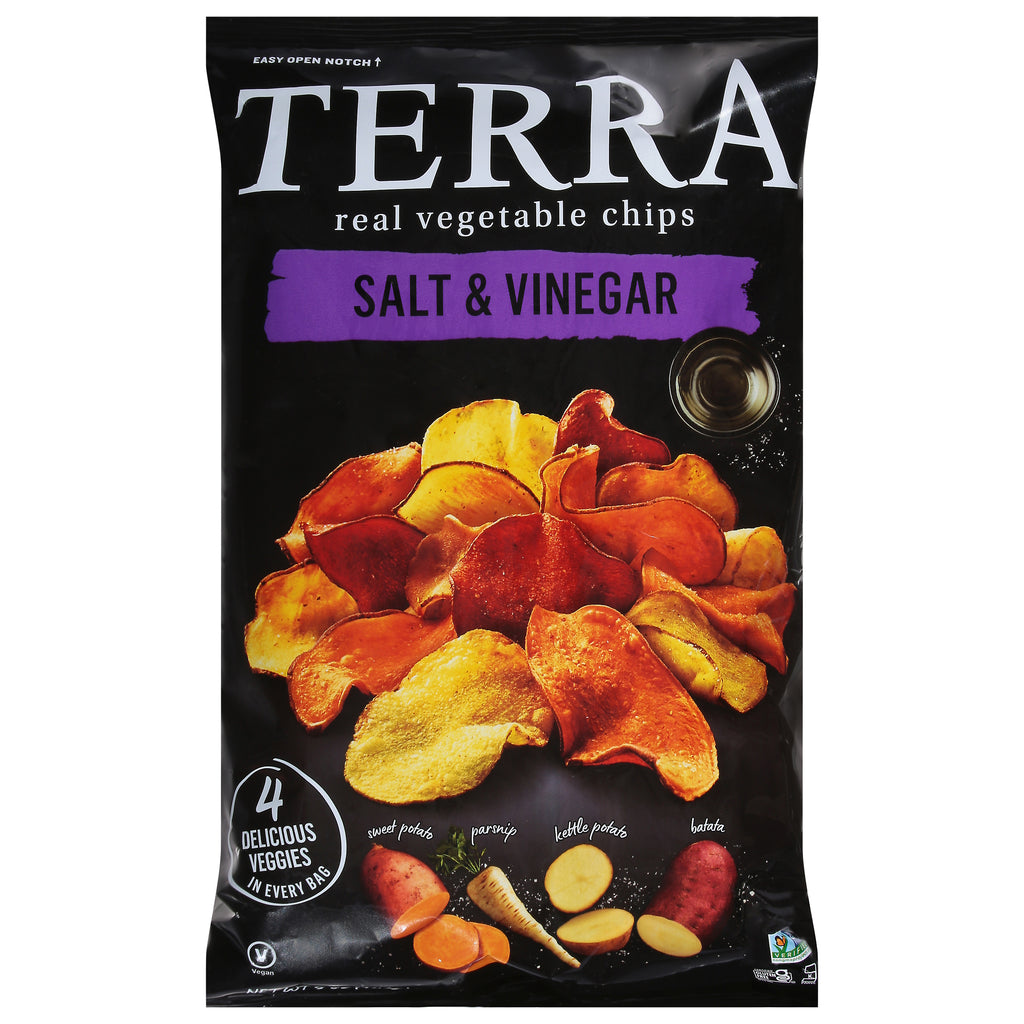 PRODUCT DETAILS: Real vegetable chips. Vegan. Certified gluten free. gfco.org. Non-GMO Project verified. nongmoproject.org. 4 delicious veggies in every bag. Over 3 decades ago, two New York Chefs came together and created a snack that not only tasted incredible but looked incredible too - and Terra chips were born. People were instantly hooked on the vibrant flavors and scrumptious crunch of the exceptional vegetable chip blend sourced with unique and diverse vegetables. Today, we continue to craft undeniably craveable and delicious Terra chips by seasoning and crisping real vegetables to perfection. Sweet Potato: (Boniato or Cuban sweet potato) light brown in color, yet darker than the Yuca. Boniato has been savored in the Caribbean for centuries. Batata: (a distinct variety of the Ipomoea Batatas) A glorious late-summer orange. Parsnip: A member of the same family as carrots, fennel, parsley, celery, celeriac and chervil. Kettle Potato: Potatoes were first cultivated by the Incas thousands of years ago. At Terra we use potato varieties like Atlantic and Snowden to make the perfect crisp and delicious kettle chips. Ruby Dipped Vegetables: Perhaps the most dramatic, these Terra chips are kissed with beet juice, resulting in their distinctive autumn red color. If you are not completely satisfied, please call 888-243-6704. www.terrachips.com. how2recycle.info.