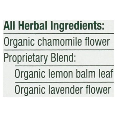 INGREDIENTS: All Herbal Ingredients: Organic Chamomile Flower, Proprietary Blend: Organic Lemon Balm Leaf, Organic Lavender Flower.