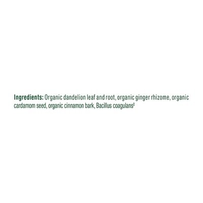 DESCRIPTION: USDA Organic. Certified Organic by CCOF. Caffeine free. Non GMO Project verified. nongmoproject.org. Digestive wellness. Supports healthy digestion. Herbal Power: Supports healthy digestion. Taste: Warm, aromatic and mildly spiced. Plant Story: Using delicious dandelion root from some of our favorite organic farms, we made this caffeine-free tea to enjoy any time of day. Combined with tasty spices like cardamom, cinnamon and ginger, and the digestive support of a probiotic, this chai-inspired tea is sure to spice up your daily wellness routine. Herbs That Work: From field to cup, we make sure our teas deliver the benefits of these amazing plants. To deliver consistent high quality teas, we source organically farmed or organically wild-collected herbs from ethical trading partnerships, seeking out medicinal-grade plants. Only a small fraction of the world's herb supply meets our high quality standards. www.traditionalmedicinals.com. Learn more about our farming communities and our work to create positive social impact at traditionalmedicinals.com. Certified B Corporation. Reduce, Reuse, Recycle: 100% recycled carton (at least 35% verified post-consumer waste). (This statement has not been evaluated by the Food and Drug Administration. This product is not intended to diagnose, treat, cure or prevent any disease.) < Organic Dandelion Leaf and Root, Organic Ginger Rhizome, Organic Cardamon Seed, Organic Cinnamon Bark, Bacillus Coagulans (Lactospore is a Registered Trademark of Sabinsa Corporation).
