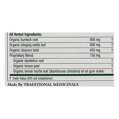 PRODUCT DETAILS: Herbal Supplement. USDA Organic. Certified Organic by CCOF. All Ingredients Certified Organic. Caffeine free. Non GMO Project verified. nongmoproject.org. Detox wellness. Supports healthy skin & liver function. Herbal Power: Promotes healthy skin, liver and kidney function. Taste: Bright, aromatic and lemony. Plant Story: This traditional European herbal formula helps beautify the skin, break down fats, and promote flushing of the kidneys. Using burdock to support the skin, dandelion to support the liver, nettles for kidneys, and cleavers for kidneys and the lymph, this light and bright blend tastes as good as it feels. Herbs that Work: From field to cup, we make sure our teas deliver the benefits of these amazing plants. To deliver consistent high quality teas, we source organically farmed or organically wild-collected herbs from ethical trading partnerships, seeking out medicinal-grade plants. Only a small fraction of the world's herb supply meets our high quality standards. 16 wrapped tea bags. traditionalmedicinals.com. Learn more about our farming communities and the work of our foundation on our website traditionmedicinals.com. Certified B Corporation. Reduce, Reuse, Recycle: 100% recycled carton (at least 35% verified post-consumer waste). 100% Renewable Energy: This product is manufactured using a mix of renewable energy including solar. Compostable Tea Bags: Tea bags are compostable and non-GMO Project verified. (These statements have not been evaluated by the Food and Drug Administration. This product is not intended to diagnose, treat, cure or prevent any disease.)