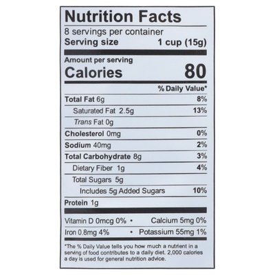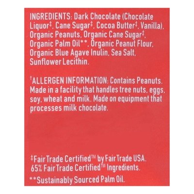 INGREDIENTS: Dark Chocolate (Chocolate Liquor (Fair Trade Certified by Fair Trade USA, 65% Fair Trade Certified Ingredients), Cane Sugar (Fair Trade Certified by Fair Trade USA, 65% Fair Trade Certified Ingredients), Cocoa Butter (Fair Trade Certified by Fair Trade USA, 65% Fair Trade Certified Ingredients), Organic Blue Agave Inulin, Sunflower Lecithin, Vanilla), Peanuts, Organic Cane Sugar (Fair Trade Certified by Fair Trade USA, 65% Fair Trade Certified Ingredients), Organic Palm Oil (Sustainably Sourced Palm Oil), Organic Peanut Flour, Organic Blue Agave Inulin, Sea Salt, Sunflower Lecithin.