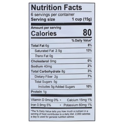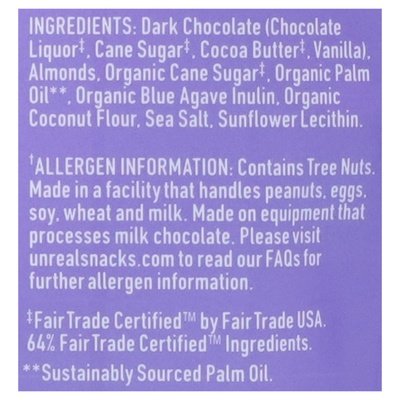 INGREDIENTS: Dark Chocolate (Chocolate Liquor (Fair Trade Certified by Fair Trade USA, 64% Fair Trade Certified Ingredients), Cane Sugar (Fair Trade Certified by Fair Trade USA, 64% Fair Trade Certified Ingredients), Cocoa Butter (Fair Trade Certified by Fair Trade USA, 64% Fair Trade Certified Ingredients), Vanilla), Almonds, Organic Cane Sugar (Fair Trade Certified by Fair Trade USA, 64% Fair Trade Certified Ingredients), Organic Palm Oil (Sustainably Sourced Palm Oil), Organic Blue Agave, Inulin, Organic Coconut Flour, Sea Salt, Sunflower Lecithin.