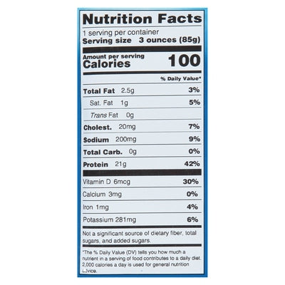 PRODUCT DETAILS: 100% pure tuna & sea salt. 21 g protein. Averages 705 mg EPA and DHA omega 3 per serving. Non-GMO Project verified. nongmoproject.org. 100% Sustainably pole & line caught. 100% pure tuna & sea salt. Our wildly good promise. Wildly good for the planet. Wildly good for you. Wildly good taste. Research shows that smaller albacore, such as used by Wild Planet, contains less mercury than larger albacore. We hand pack 100% tuna and sea salt. No water, oil or filler added. All omega 3s are retained. Please don€™t drain. wildplanetfoods.com/faqs/. Non-BPA lining explained at wildplanetfoods.com/faqs/ Dolphin safe. Fish caught in the North Pacific. Processed in Thailand.