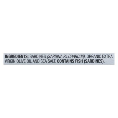 INGREDIENTS: Sardines (Sardina Pilchardus), Organic Extra Virgin Olive Oil and Sea Salt.