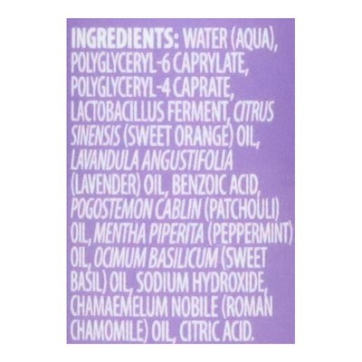 INGREDIENTS: Water (Aqua), Citrus Sinensis (Sweet Orange) Oil, Lavandula Angustifolia (Lavender) Oil, Pogostemon Cablin (Patchouli) Oil, Mentha X Piperita (Peppermint) Oil, Ocimum Basilicum (Sweet Basil) Oil Chamaemelum Noble (Roman Chamomile) Oil.