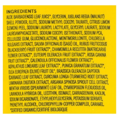 INGREDIENTS: Aloe Barbadensis Leaf Juice (Certified Organic), Glycerin, Juglans Regia (Walnut) Shell Powder, Illite, Sodium Methyl Cocoyl Taurate, Citrus Limon (Lemon) Peel, Sodium Lauroyl Lactylate, Glyceryl Laurate, Sodium Lauroamphoacetate, Sodium Cocoyl Isethionate, Sodium PCA, Cellulose Gum, Gluconolactone, Montmorillonite, Chlorella Vulgaris Extract, Salvia Officinalis (Sage) Oil, Rubus Fruticosus (Blackberry) Fruit Extract (Certified Organic), Chamomilla Recutita (Matricaria) Flower Extract (Certified Organic), Euterpe Oleracea Fruit Extract (Certified Organic), Rosa Canina Fruit Extract (Certified Organic), Calendula Officinalis Flower Extract (Certified Organic), Aspalathus Linearis Leaf Extract (Certified Organic), Punica Granatum Extract (Certified Organic), Olea Europaea (Olive) Fruit Oil (Certified Organic), Brassica Oleracea Capitata (Cabbage) Leaf Extract, Curcuma Longa (Turmeric) Root Extract, Mentha Viridis (Spearmint) Leaf Oil, Cymbopogon Flexuosus Oil, Lavandula Hybrida Oil, Lecithin, Isomalt, Carrageenan, Kaolin, Sodium Bicarbonate, Ethylhexylglycerin, Potassium Sorbate, Phenethyl Alcohol, Chlorophyllin-Copper Complex, Caramel.